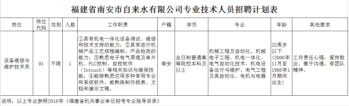 福建省南安市自來水有限公司于2018年9月公開招聘專業(yè)技術人員,其中02崗位(設備維修與維護技術員)未招聘到人員,現(xiàn)擬面向社會公開補充招聘1名專業(yè)技術人員?,F(xiàn)將有關事項通告如下: